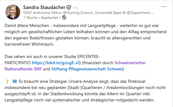 Siehe ganze Konversation auf LinkedIn: Damit ältere Menschen – insbesondere mit Langzeitpflege – weiterhin so gut wie möglich am gesellschaftlichen Leben teilhaben können und den Alltag entsprechend den eigenen Bedürfnissen gestalten können, braucht es altersgerechten und barrierefreien Wohnraum. Dies sehen wir auch in unserer Studie EPICENTRE-PARTICIPATIO (finanziert durch Schweizerischer Nationalfonds SNF und Stiftung Pflegewissenschaft Schweiz) […]